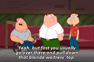 Yeah, but first you usually go over there and pull down that blonde waitress' top. (WOMAN SCREAMS) (SLAP) She screamed, so I had to slap her.