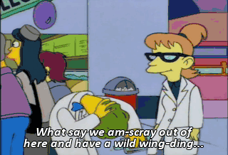 What say we am-scray out of here and have a wild wing-ding... at the cyclotron, Doctor? Anything you say, Professor. Whoa!