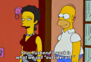 Your husband's work is what we call "outsider art." It could be by a mental patient or a hillbilly or a chimpanzee.