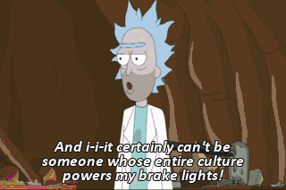And i-i-it certainly can't be someone whose entire culture powers my brake lights! Go, go, go! Oh, my god, Oh, god,