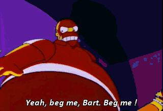 Yeah, beg me, Bart. Beg me ! Lisa, I beg of you. Please forgive me ! Now we can blame him for everything ! It's your fault I'm bald ! I'm sorry. It's your fault I'm old !
