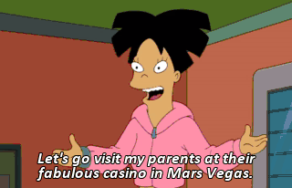 Let's go visit my parents at their fabulous casino in Mars Vegas. (ALL CLAMORING EXCITEDLY) Take that, Earth! Look out, penny slots. I've got a system.