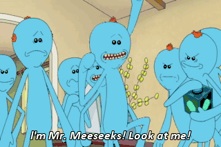 l'm Mr. Meeseeks! Look at me! Kill him! How are you today? l'm Mr. Jelly Bean. Hi, Mr. Jelly Bean.