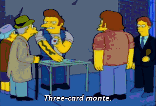 Three-card monte. Whoo-hoo! Easy money! Homer, these games are fixed. Then how come that guy's winning? - Whoa! I, like, totally won again. - Way to go, bro.