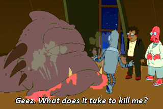 Geez. What does it take to kill me? Bender, you blew out your excess capacity. You're cured! Sweet mercy! My hellish nightmare is over! I never have to party again. Well, that's that then.