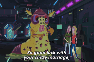 So good luck with your shitty marriage, and tell Rick I'm sorry he has to deal with either of you. Blim Blam out. You know what? I'm taking this.