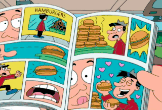 (PETER) Look at all those hamburgers. You can't eat all those hamburgers, you stupid fellow! Oh, jeez. Ah, He's gonna do it! Oh, He's so ridiculous.