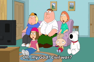 Oh, my God! Civil war? See, Brian? This is exactly what I was talking about. Look, Stewie, this doesn't necessarily mean things are going to turn out badly.