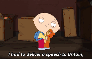 I had to deliver a speech to Britain, and I overcame my stutter through some pretty kooky means. Brian, don't say anything. Uh, Stewie? Oh, crap. This is not the way out! This is not the way out!