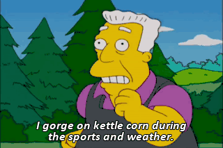 I gorge on kettle corn during the sports and weather.