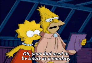 Oh, your dad used to be smart as a monkey. Then his mind started gettin' lazy, and now he's dumb as a chimp.