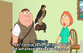 No! I am a falconer and I will eat whatever Xerxes brings me. Feed master. Peter, what the hell? For Xerxes, every meal is a pageant.