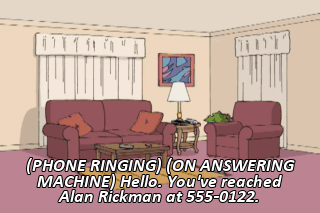 (PHONE RINGING) (ON ANSWERING MACHINE) Hello. You've reached Alan Rickman at 555-0122.