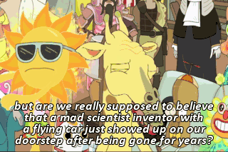 but are we really supposed to believe that a mad scientist inventor with a flying car just showed up on our doorstep after being gone for years?