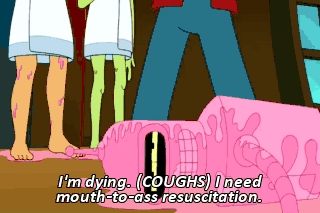 I'm dying. (COUGHS) I need mouth-to-ass resuscitation. I'm on it! (INHALES) (BLOWING) (MUFFLED) It's not working!
