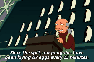Since the spill, our penguins have been laying six eggs every 15 minutes. Also, the eggs hatch in only 12 hours. Also, the males are layin' eggs. This man has over-gasped.