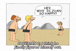 CAVEMAN 2: I think he finally figured himself out. CAVEMAN 1: Huh, I guess it takes Juan to know Juan. (LAUGHING)