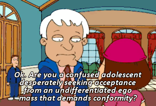 Ok. Are you a confused adolescent desperately seeking acceptance from an undifferentiated ego mass that demands conformity? Wow, that sort of sounds more like me.