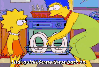 Lisa, quick! Screw these back on. Mom, calm down. The party's not for another three hours. Oh, good. That will give me time to add another coat of glaze to the ham.