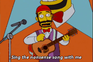 Sing the nonsense song with me Yum yum wow Woop de we Flibberty flabberty one two three Ow! Okay, who threw that? Who threw it?