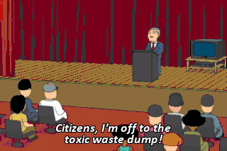 Citizens, I'm off to the toxic waste dump! Mayor West, you have lymphoma. Oh, my! Probably from rolling around in that toxic waste. I see. What in God's name were you trying to prove?