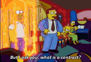 But I ask you, what is a contract? Webster's defines it as "an agreement under the law which is unbreakable." "Which is unbreakable"! Excuse me. I must use the restroom.