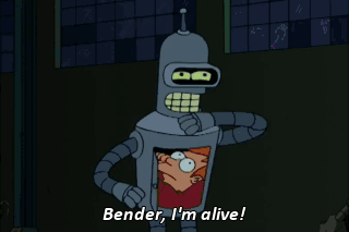 Bender, I'm alive! You didn't hurt me at all but I know you wanted to, and that's what matters. Here's to you. Hey, that's my last beer, you bastard! I'll kill you! I'll kill you, too, buddy. I'll kill you, too.