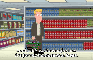 Look, this isn't even for me. It's for my homosexual lover. MALE ANNOUNCER: Uh, uh, uh. The Bible's pretty clear about that.