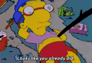 Looks like you already did. What are you talkin' about? You ate our food! Thanks a lot, Milhouse. Now we're all gonna die because of you. But I swear I didn't do it! Nacho cheese. Get him!