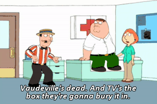 Vaudeville's dead. And TV's the box they're gonna bury it in. Back then, everybody had a specialty. I, for one, am a tumbler. Watch me leap through this big hoop. Vamp! Vamp!
