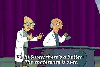 Wait! Surely there's a better-- The conference is over. I must go now to help collect cans on jupiter. Peace out, y'all! Destroy all robots! Destroy all robots! Poor Bender.