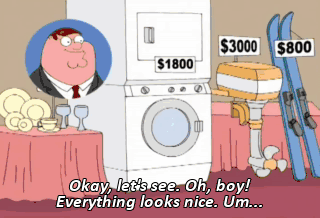 Okay, let's see. Oh, boy! Everything looks nice. Um... All right, I'll take the ceramic Dalmatian for $600. And, uh, boy, that TV looks nice.
