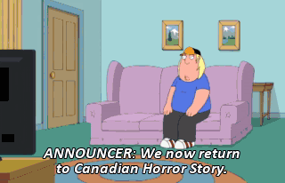 ANNOUNCER: We now return to Canadian Horror Story. Hey, hon, we're out of Molson. Oh, not to worry. We've got some Labatt's in the garage. And could you get one for the ghost? Boo, eh?