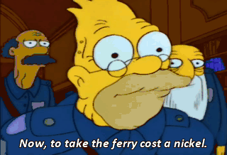 Now, to take the ferry cost a nickel. And in those days, nickels had pictures of bumblebees on 'em. "Give me five bees for a quarter," you'd say. Now, where were we? Oh, yeah!