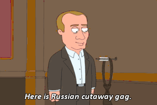 Here is Russian cutaway gag. (EXCLAIMING IN RUSSIAN) (LAUGHING) Where the hell is Quagmire?