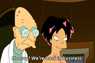 Hooray! We're back in business. Over my dead body. Uh, never mind.