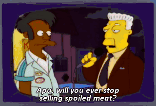 Apu, will you ever stop selling spoiled meat? No. I mean, yes. I mean-- Uh-oh. I think I come off very well. Monster! Run, children!