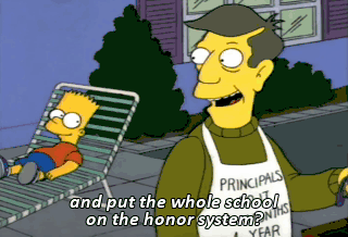 and put the whole school on the honor system? Yeah. The teachers are afraid to leave the faculty lounge.