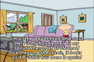 I'm a little teapot short and stout Here is my handle, here is my spout When I get all steamed up, hear me shout Lois, it looks as if Puddles has done it again!