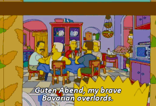 Guten Abend, my brave Bavarian overlords. The best wurst in town. Here is your tip, Baldylocks. If you want it, dance und sing. Oh! (SINGING IN GERMAN)