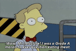 Wow, Mr. McClure! I was a Grade A moron to ever question eating meat. Yes, you were, jimmy. Yes, you were. Ow. You're hurting me. They can't seriously expect us to swallow that tripe.