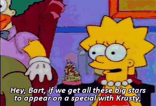 Hey, Bart, if we get all these big stars to appear on a special with Krusty, it might get his career going again. Here's my address book. Go get those stars!