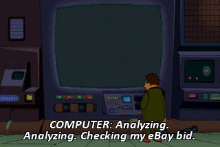 COMPUTER: Analyzing. Analyzing. Checking my eBay bid. (BUZZER SOUNDING) Damn it! Analysis complete. Hey, I was nuzzling that. COMPUTER: Attributes transferred. Shoe size 12. Et cetera.