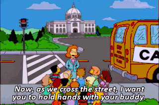 Now, as we cross the street, I want you to hold hands with your buddy. Hey, dude, who’s your girlfriend? Did you see his face'?