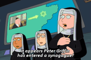 it appears Peter Griffin has entered a synagogue! Lock and load, Brides of Christ! Excellent, excellent! Hello.