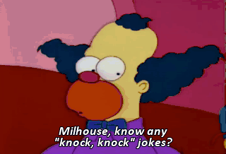 Milhouse, know any "knock, knock" jokes? I want to go home. Homer, maybe you better take Milhouse home. Gladly.