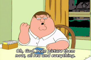 Oh, God, I can picture them now, all red and everything. That's right, Peter, they are red. Lois, what are you doing? I switched Peter's questions to the pre-school edition.
