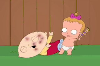 (SOBBING IN PAIN) Oh, my God! Stewie! (CHUCKLES) Your kid got beat up by a baby girl! Oh, man! This is more painful to watch than when Family Ties does a Tina Yothers episode.