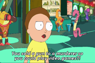 You sold a gun to a murderer so you could play video games?! Yeah, sure, I mean, if you spend all day shuffling words around, you can make anything sound bad, Marty, Here, check this out. Aah!