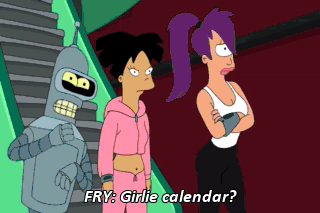 FRY: Girlie calendar? Great idea, Amy. Okay, then. Leela, Amy, come to work topless tomorrow.